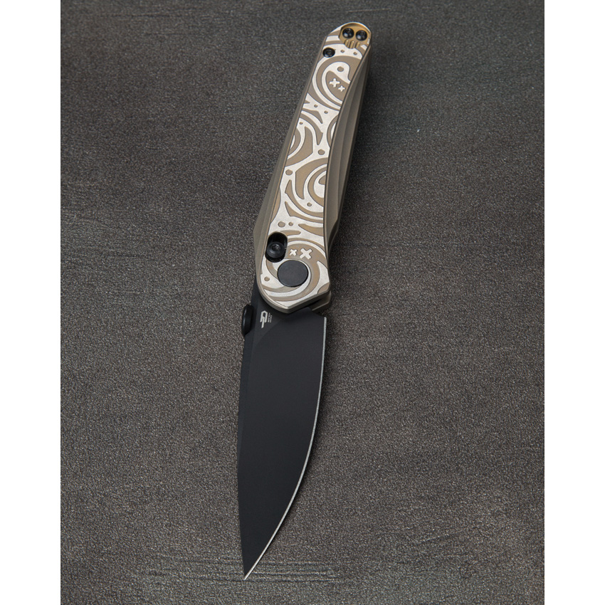4.5″ (11.43cm) closed. 3.5″ (8.89cm) black finish Bohler M390 stainless blade. Bronze and gray titanium handle. Thumb disk. Pocket clip. Black nylon zippered storage case. Boxed.