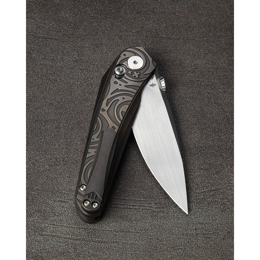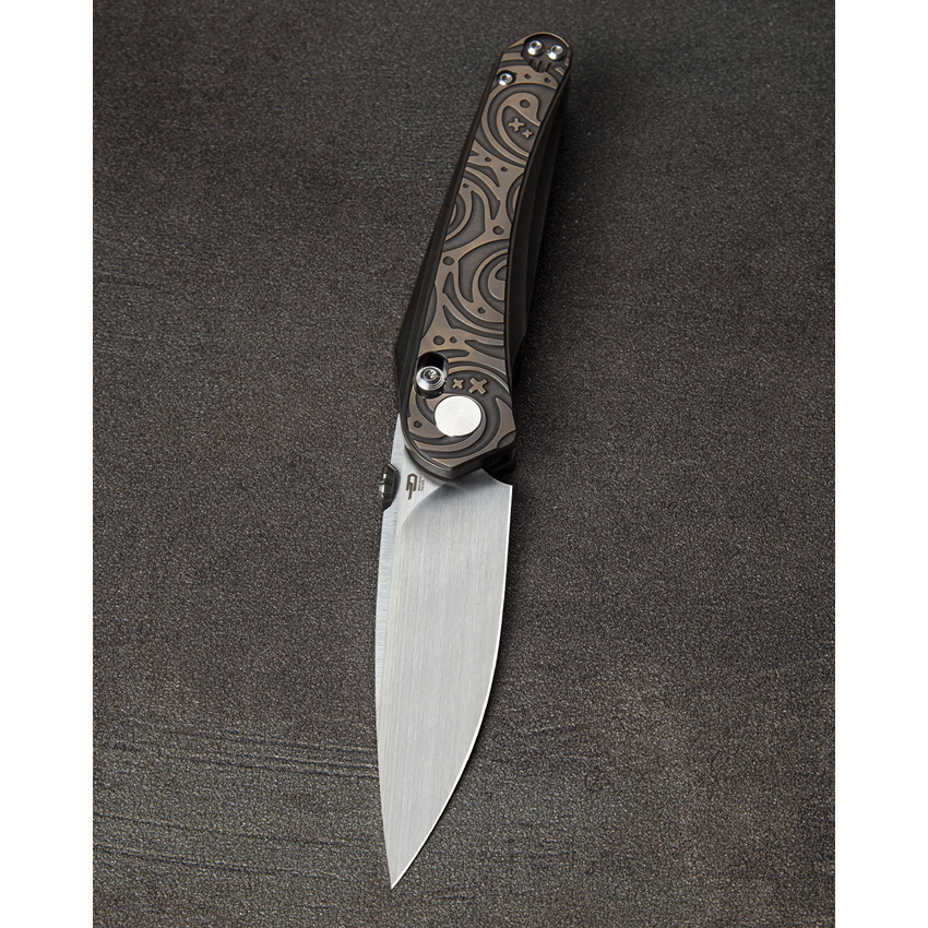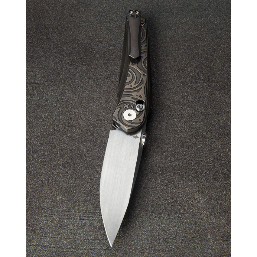 4.5″ (11.43cm) closed. 3.5″ (8.89cm) Bohler M390 stainless blade. Black and bronze titanium handle. Thumb disk. Pocket clip. Vertical satin finish blade. Black nylon zippered storage case. Boxed.
