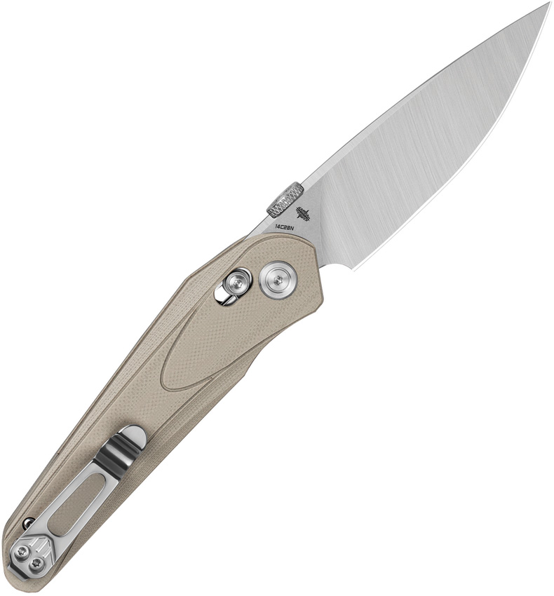 4.5″ (11.43cm) closed. 3.5″ (8.89cm) stonewash and satin finish 14C28N Sandvik stainless blade. Tan G10 handle. Thumb disk. Pocket clip. Boxed.