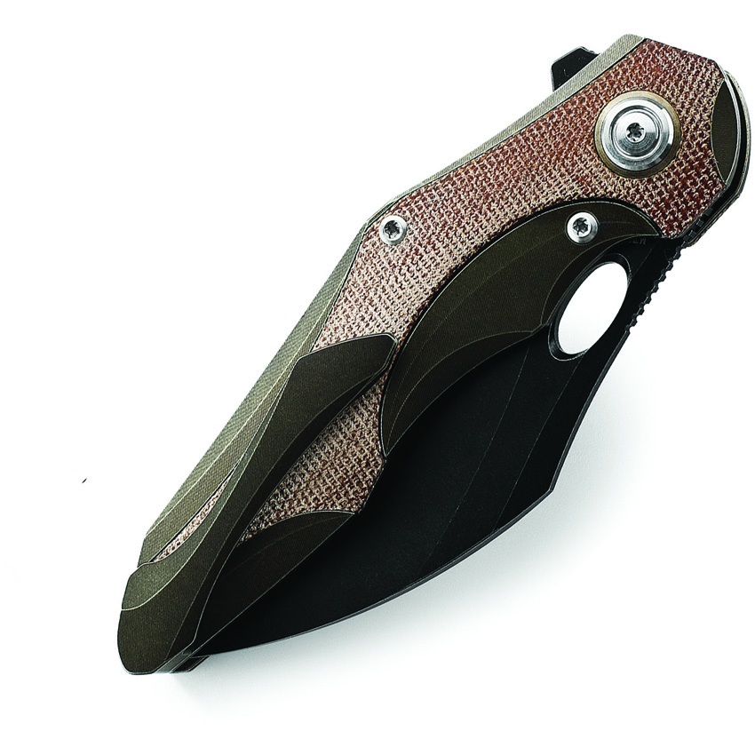 4.63″ (11.76cm) closed. 3.38″ (8.59cm) black stonewash finish Bohler M390 stainless blade. Bronze stonewash finish titanium handle with Natural canvas micarta inlay. Extended tang. Thumb pull. Pocket clip. Design by Kombou. Boxed.