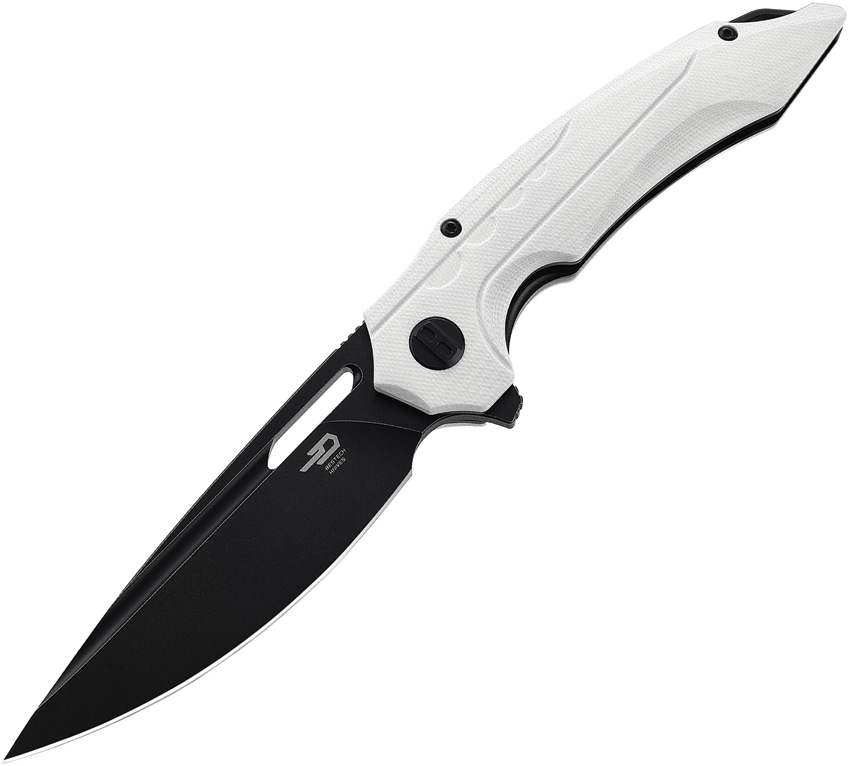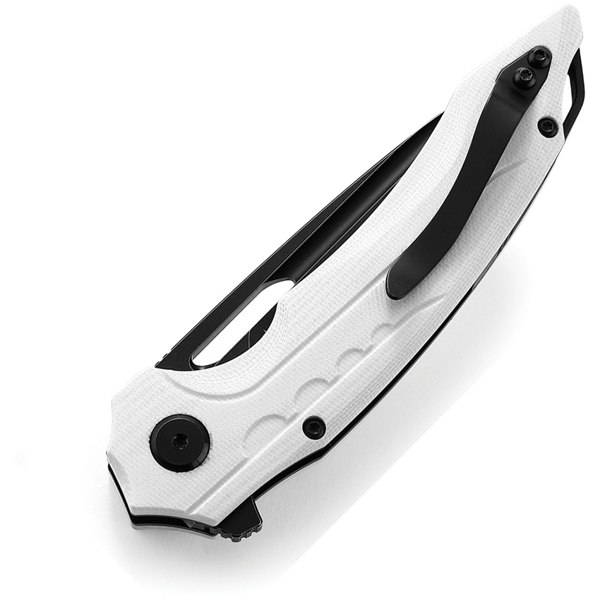 4.5″ (11.43cm) closed. 3.5″ (8.89cm) black stonewash finish Bohler N690 stainless blade. White G10 handle. Extended tang. Lanyard hole. Pocket clip. Thumb pull. Boxed.