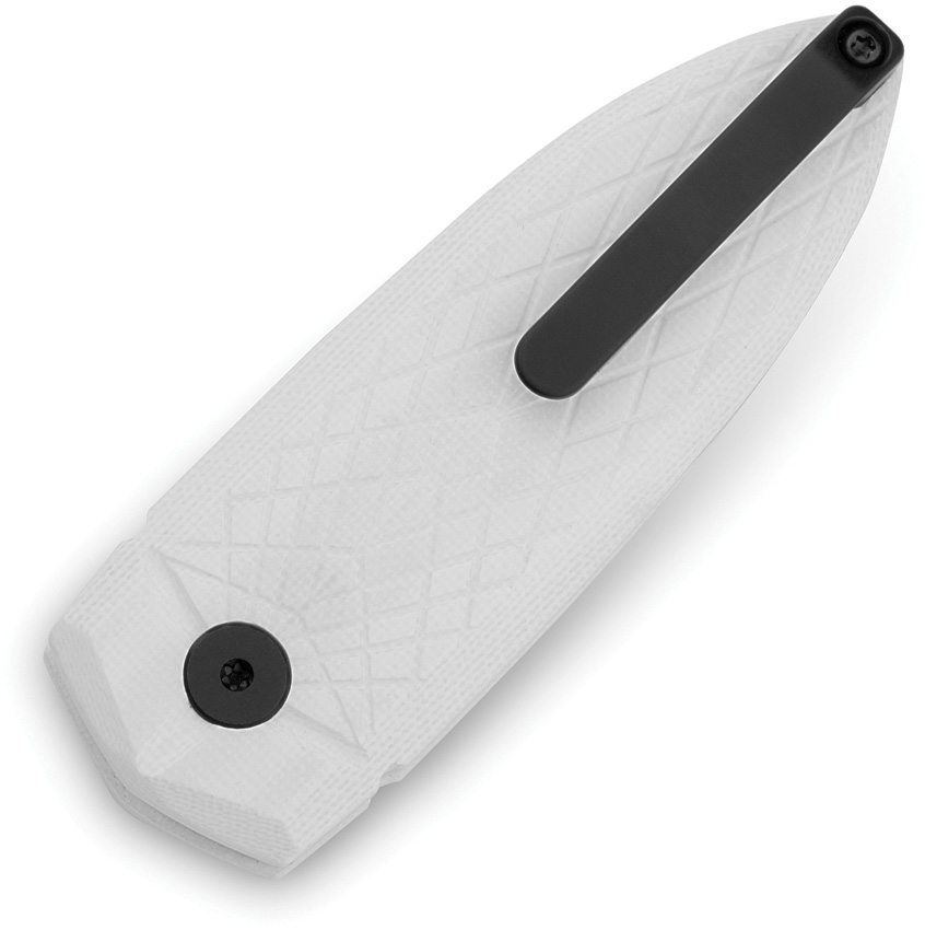 3.25″ (8.26cm) closed. 2.25″ (5.72cm) black DLC coated 14C28N Sandvik stainless spear point blade. White G10 handle. Pocket clip. Boxed.