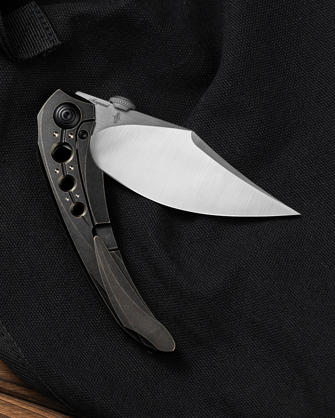 4.88″ (12.4cm) closed. 3.88″ (9.86cm) satin finish M-Cut blade. Black titanium handle. Thumb disk. Pocket clip. Boxed.