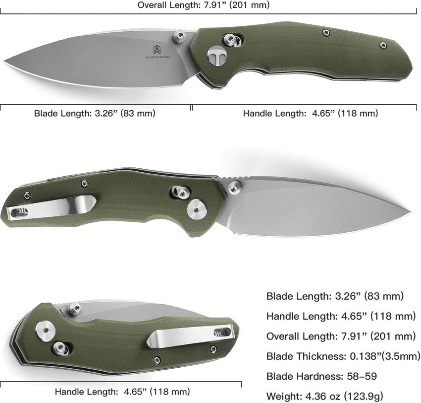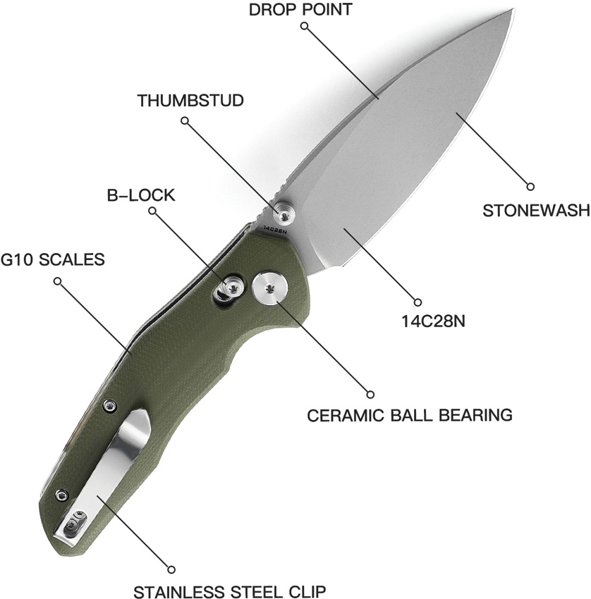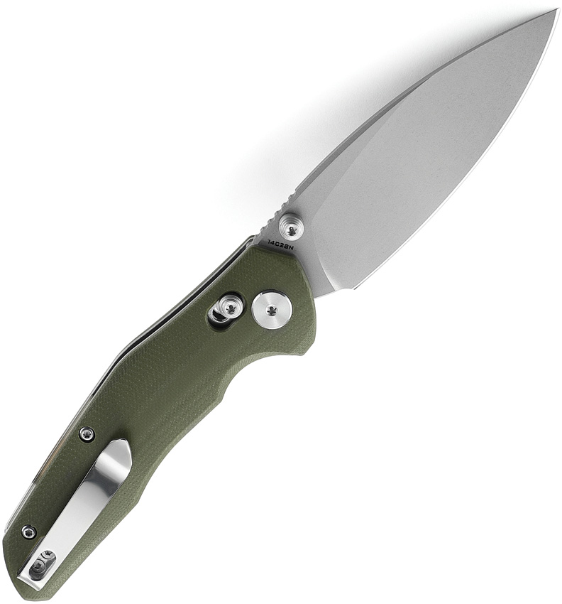 4.63″ (11.76cm) closed. 3.25″ (8.26cm) stonewash finish 14C28N Sandvik stainless blade. OD green G10 handle. Thumb stud. Pocket clip. Boxed.