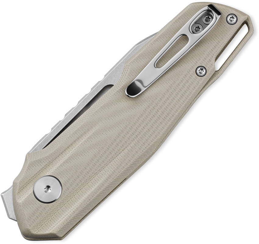 4.25″ (10.8cm) closed. 2.75″ (6.99cm) stonewash and satin finish 14C28N Sandvik stainless blade. Desert tan G10 handle. Thumb pull. Lanyard hole. Pocket clip. Boxed.