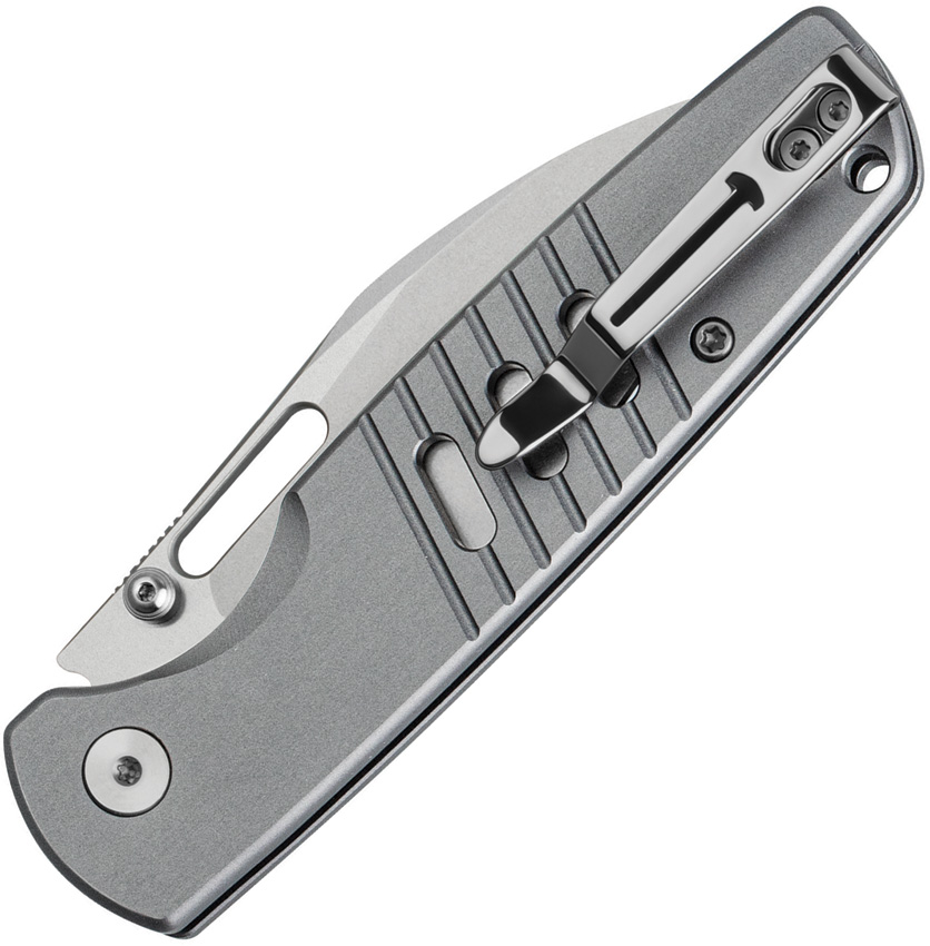 4.13″ (10.49cm) closed. 3.13″ (7.95cm) stonewash finish D2 tool steel blade. Gray anodized aluminum handle. Thumb stud. Thumb pull. Lanyard hole. Pocket clip. Boxed.