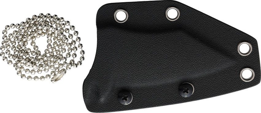 5.25″ (13.34cm) overall. 3″ (7.62cm) black coated D2 tool steel modified drop point blade. One-piece construction. Lanyard hole. Finger ring. TekLok and ball chain lanyard. Black Kydex belt sheath. Bagged.