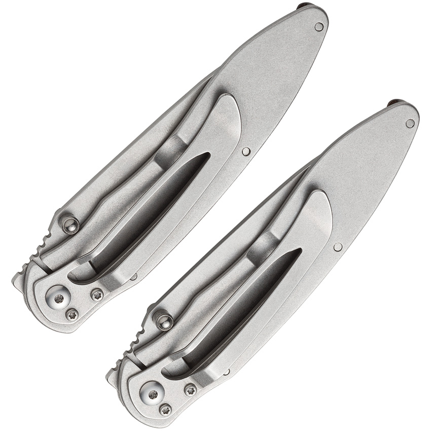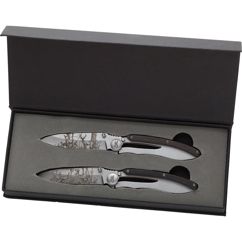 4.25″ (10.8cm) closed. 3.25″ (8.26cm) stonewash finish stainless blade. Walnut handle. Thumb stud. Pocket clip. Blade etching. Set of two, each with a buck and doe scene on the blade. Gift boxed.
