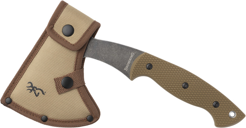 10.75″ overall. 4.75″ black oxide coated 3Cr13MoV stainless axe head with 3.75″ cutting edge. Full tang. Lanyard hole. Tan nylon belt sheath. Clam packed.