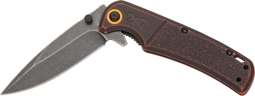 4.13″ (10.49cm) closed. 3″ (7.62cm) black stonewash finish D2 tool steel blade. Extended tang. Thumb stud. Lanyard hole. Pocket clip. Black stonewash orange finish laminate handle. Boxed.