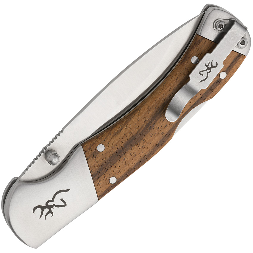 4.38″ (11.13cm) closed. 3.5″ (8.89cm) satin finish 9Cr18MoV stainless clip point blade. Zebra wood handle. Stainless bolster(s). Thumb stud. Pocket clip. Boxed.