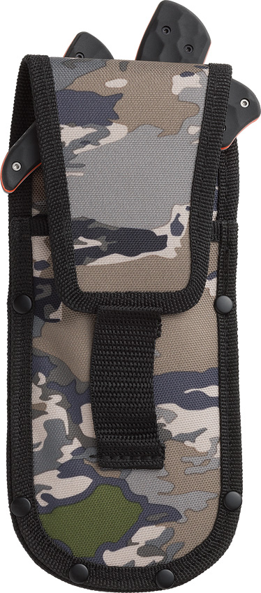 Black coated stainless blade. Black and orange TPR handle. Full tang. Includes: 8″ overall caping with 3.5″ blade; 8.75″ overall skinner with 3.75″ blade; 7.75″ overall saw with 5.25″ blade. Camo nylon belt sheath. Boxed.