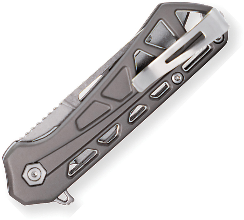 3.38″ (8.59cm) closed. 2.38″ (6.05cm) stonewash finish 7Cr17MoV stainless blade. Gray skeletonized aluminum handle. Extended tang. Pocket clip. Thumb pull. Boxed.