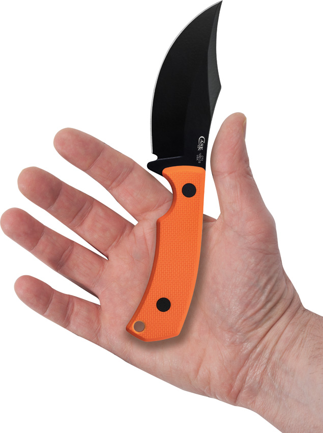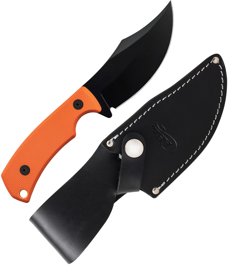 8″ (20.32cm) overall. 3.5″ (8.89cm) black finish 1095HC steel skinner blade. Orange G10 handle. Full tang. Black leather belt sheath. Boxed.