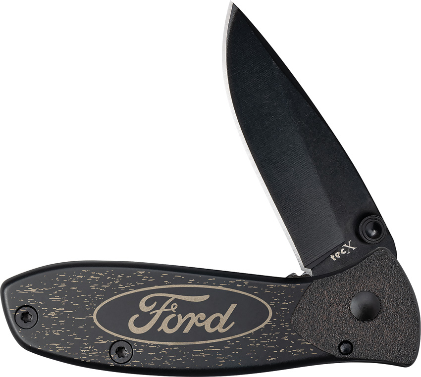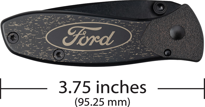 T0103.75B. 3.75″ (9.53cm) closed. 2.75″ (6.99cm) black coated stainless blade. Black finish stainless handle. Thumb stud. Pocket clip. Ford handle embellishment. Boxed.