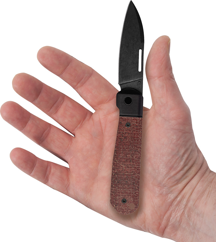 Black stonewash finish CPM-20CV stainless Modified Wharncliffe blade. Dark Red burlap micarta handle. Stainless bolster(s). Lanyard hole. Pocket clip. Boxed.