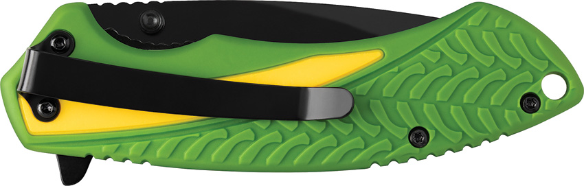 4.5″ (11.43cm) closed. 3.25″ (8.26cm) black finish stainless blade. Green and yellow nylon handle. Extended tang. Lanyard hole. Pocket clip. Boxed.