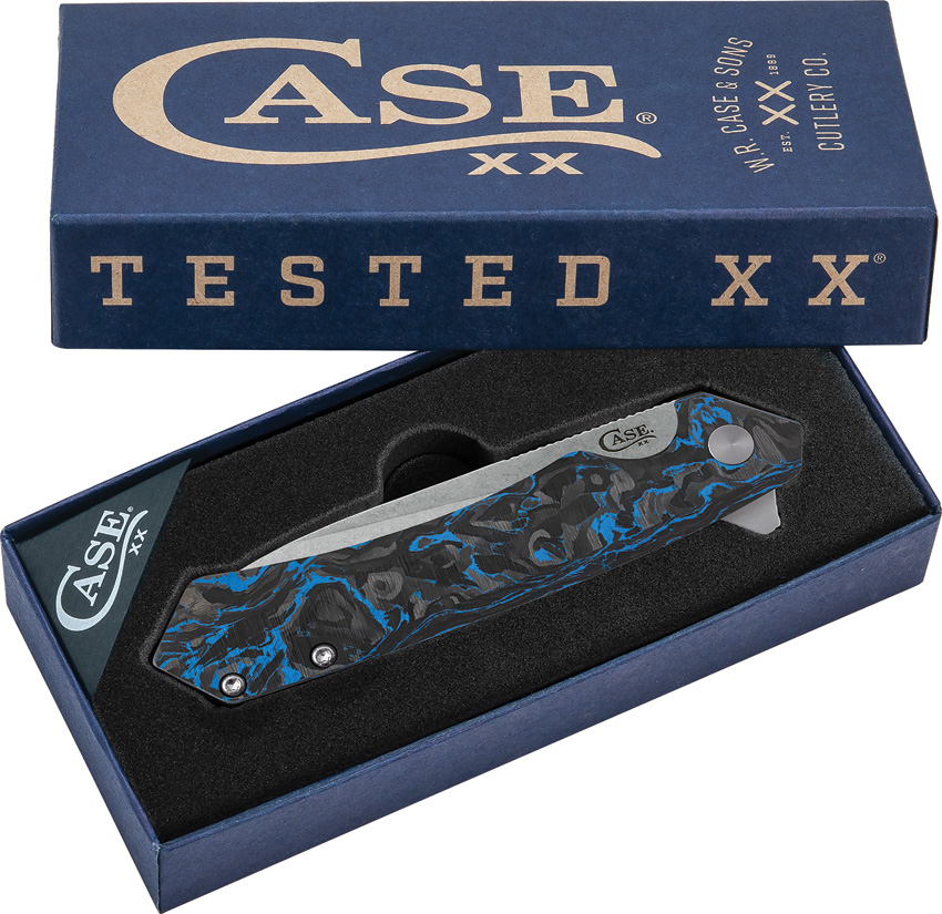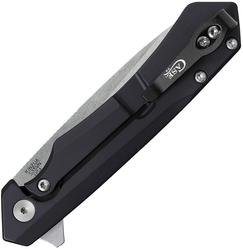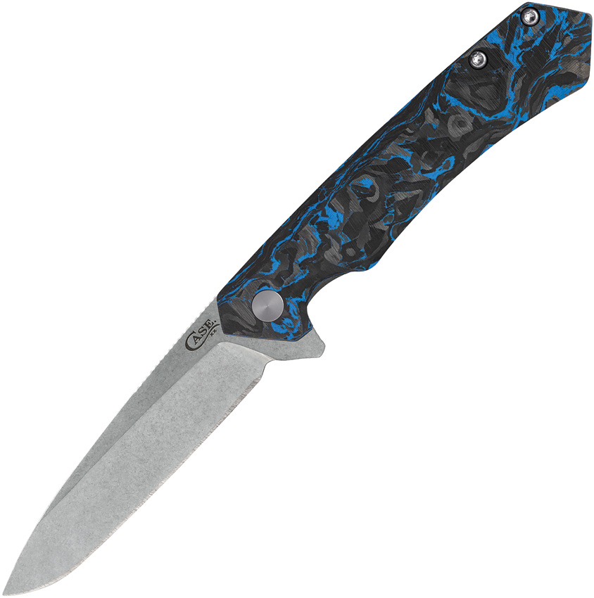 KINZUA S35VN pattern. 4.75″ (12.07cm) closed. 3.75″ (9.53cm) stonewash finish S35VN stainless spear point blade. Black and blue carbon fiber handle with Black stonewash finish aluminum back handle. Extended tang. Pocket clip. Boxed.