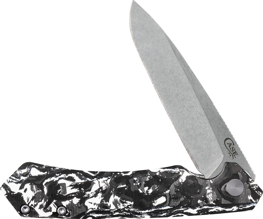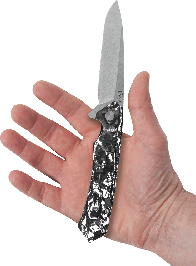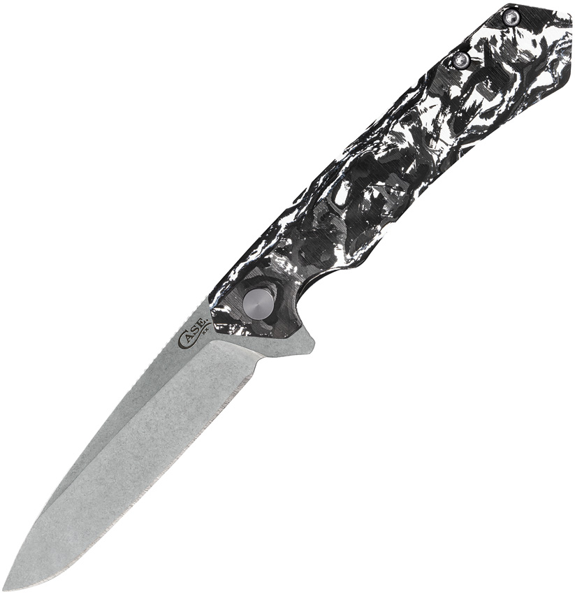 KINZUA S35VN pattern. 4.75″ (12.07cm) closed. 3.75″ (9.53cm) stonewash finish S35VN stainless spear point blade. Black and white carbon fiber handle with Black stonewash finish aluminum back handle. Extended tang. Pocket clip. Boxed.