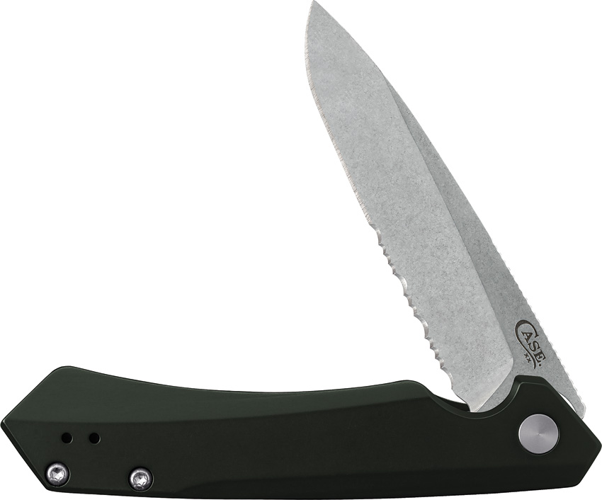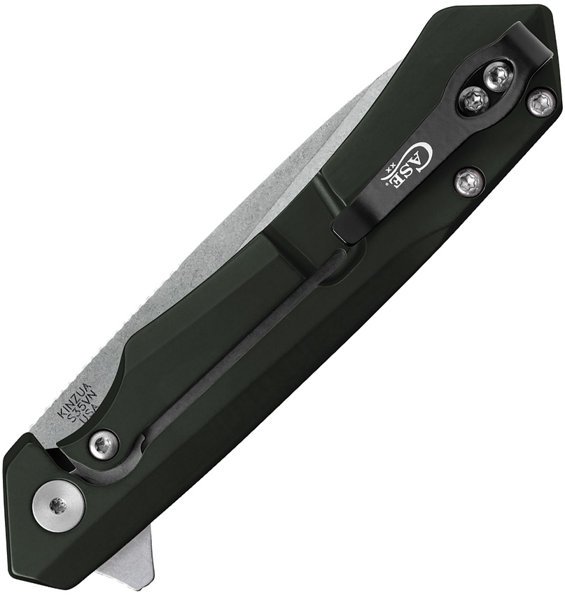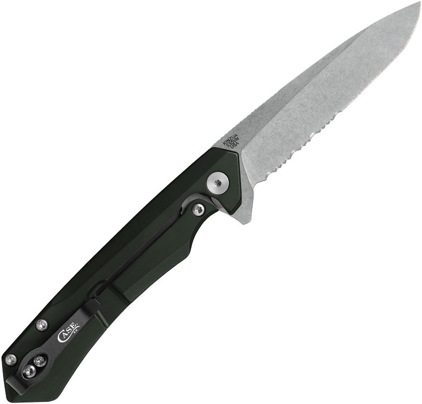 KINZUA S35VN pattern. 4.75″ (12.07cm) closed. Stonewash finish partially serrated S35VN stainless spear point blade. OD green anodized aluminum handle. Pocket clip. Boxed.