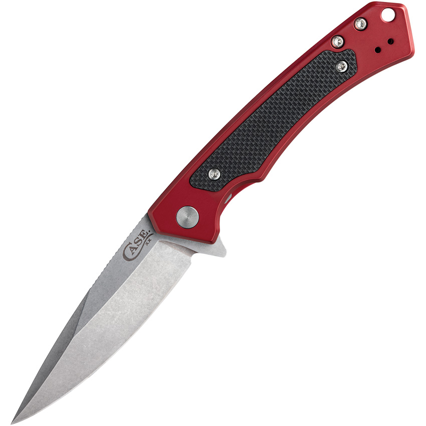 MARILLA. 4.75″ (12.07cm) closed. 3.75″ (9.53cm) stonewash finish S35VN stainless blade. Red aluminum handle with black G10 inlay. Extended tang. Pocket clip. Boxed.