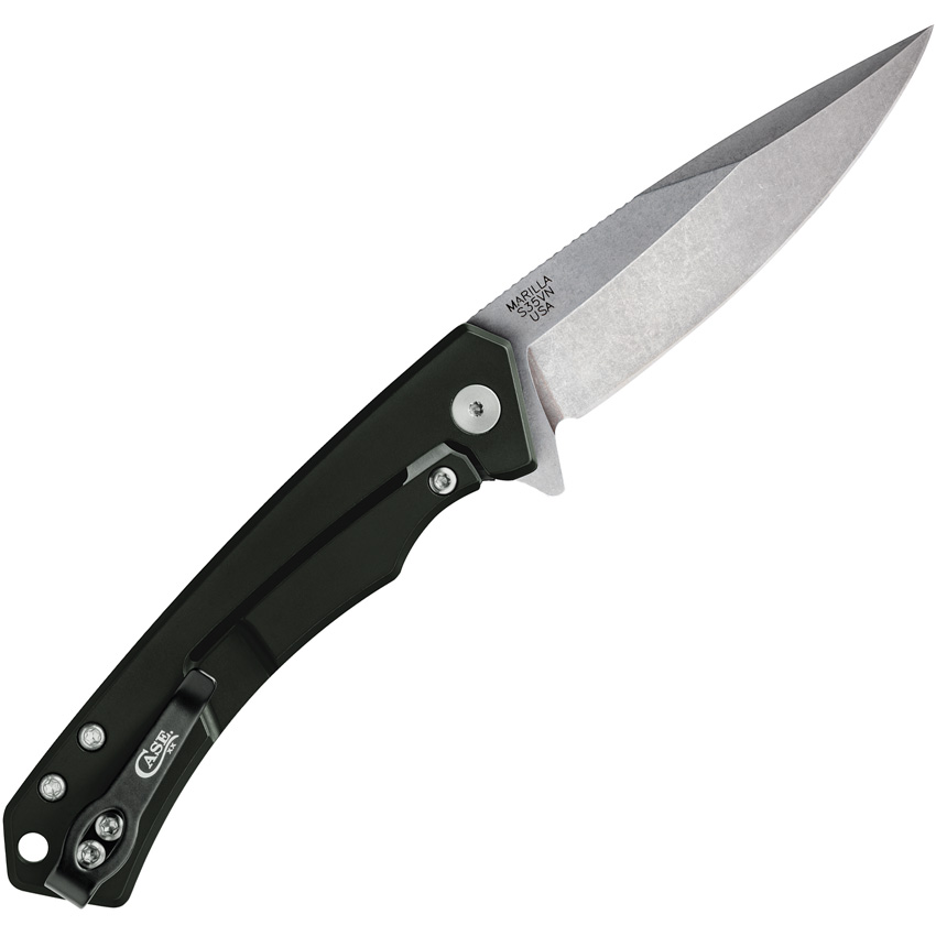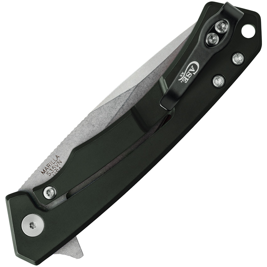 MARILLA pattern. 4.75″ (12.07cm) closed. 3.75″ (9.53cm) stonewash finish S35VN stainless blade. OD green aluminum handle with black G10 inlay. Lanyard hole. Pocket clip. Boxed.