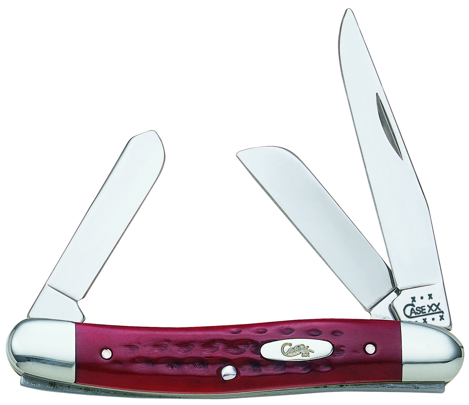 Red Pocket Worn. 6318SS pattern. 3 5/8″ closed. Stainless clip, spey and sheepsfoot blades. Red jigged bone handles with special hand finishing for a pocket worn feeling. Nickel silver bolsters and script style Case inlay shield.