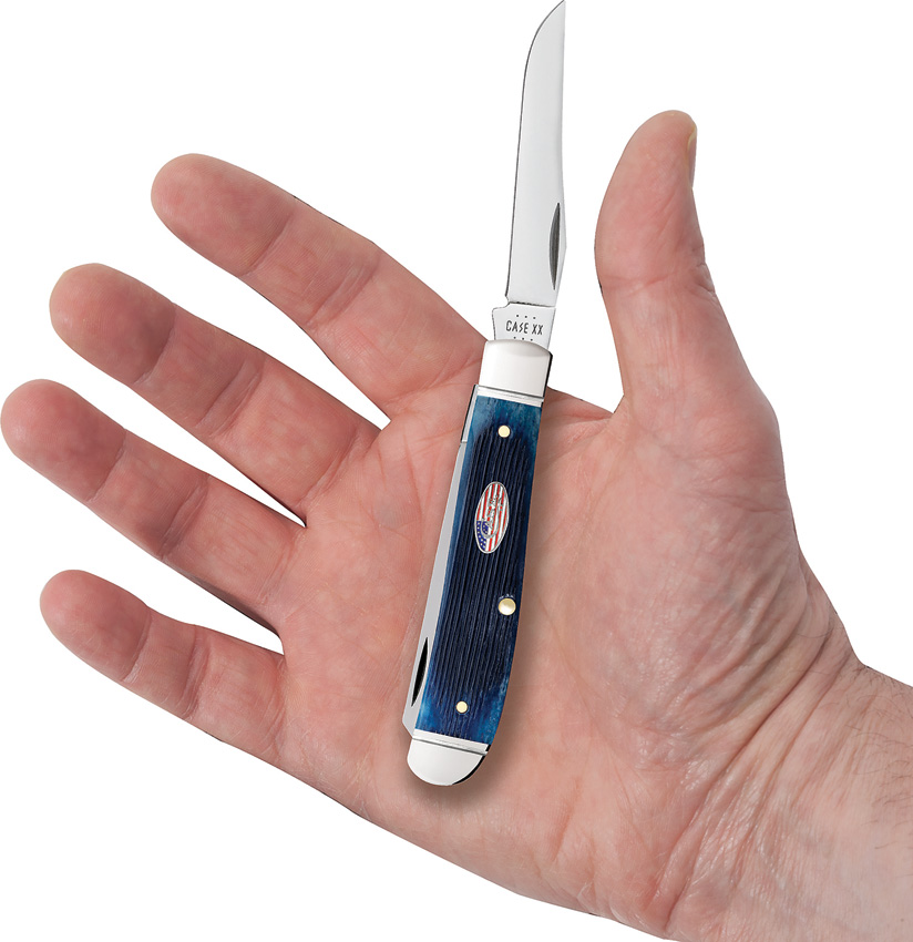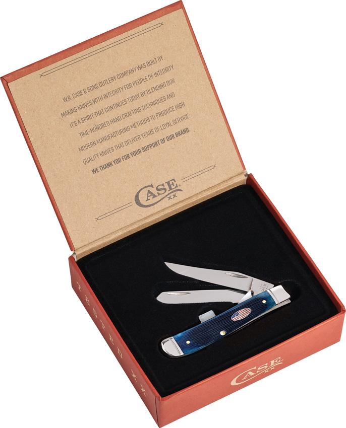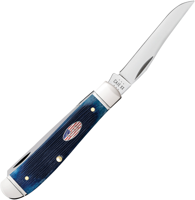 6207 SS pattern. 3.5″ (8.89cm) closed. Mirror finish stainless clip and spey blades. Navy Blue Barnboard jigged bone handle. Stainless bolster(s). Inlay shield. Gift boxed.