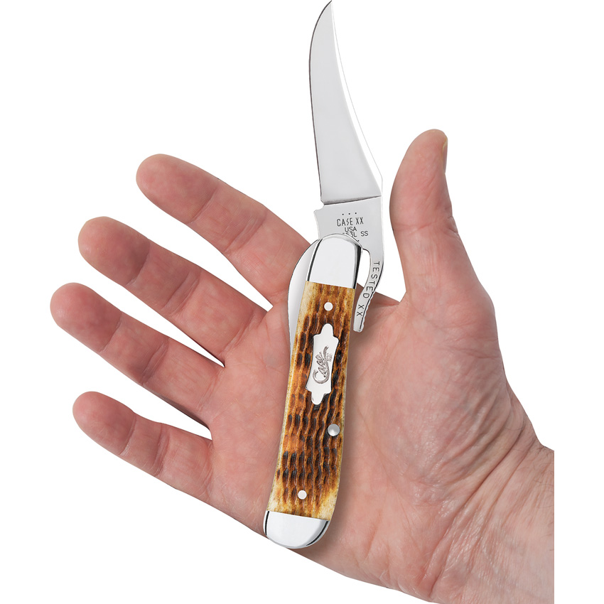 61953L SS pattern. 4.25″ (10.8cm) closed. Mirror finish stainless one-hand opening clip blade. Antique Rogers corn cob jigged bone handle. Nickel silver bolster(s). Extended tang. Inlay shield. Boxed.