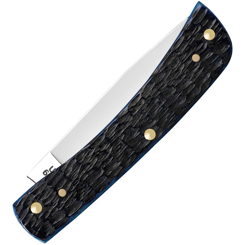 6137 SS pattern. 3.63″ (9.22cm) closed. Mirror finish stainless skinner blade. Navy Blue jigged bone handle. Inlay shield. Boxed.