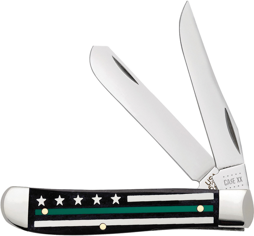 6207 SS pattern. 3.5″ (8.89cm) closed. Mirror finish stainless clip and spey blades. Black smooth bone handle. Nickel silver bolster(s). Green line flag on handle. Boxed.