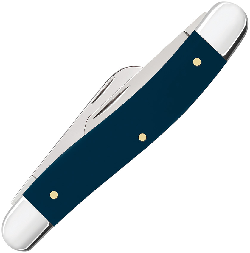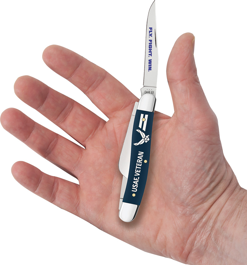 4318 SS pattern. 3.63″ (9.22cm) closed. Mirror finish stainless clip, sheepsfoot, and spey blades. Navy Blue smooth synthetic handle. Nickel silver bolster(s). Blade etching. U. S. Air Force handle embellishment. Boxed.