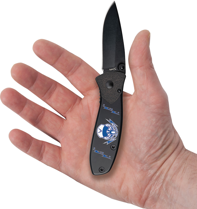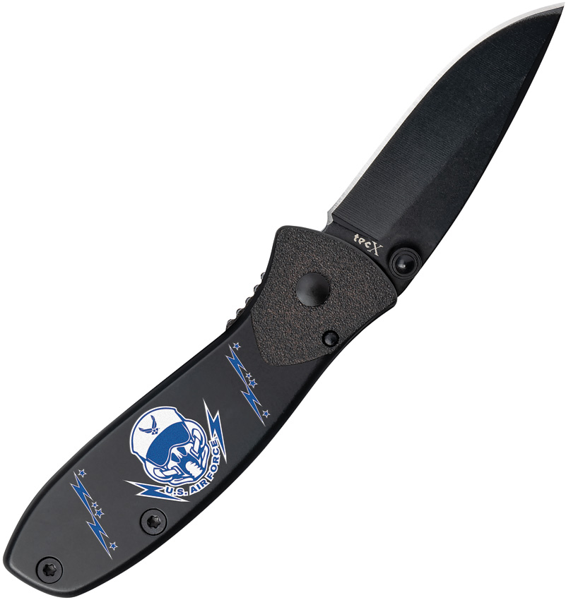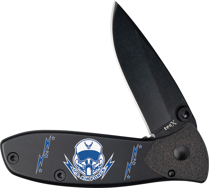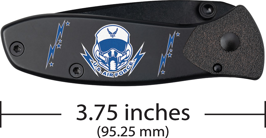 T0103.75B. 3.75″ (9.53cm) closed. 2.75″ (6.99cm) black coated stainless blade. Black finish stainless handle. Thumb stud. Pocket clip. U. S. Air Force handle artwork. Boxed.