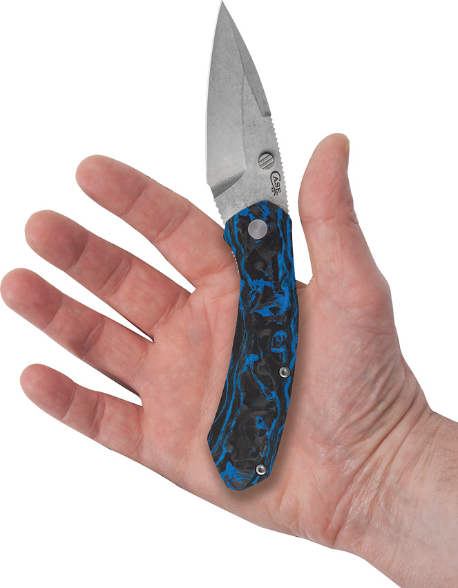 WESTLINE S35VN pattern. 4.63″ (11.76cm) closed. 3.5″ (8.89cm) stonewash finish S35VN stainless modified drop point blade. Black and blue carbon fiber handle. Thumb stud. Pocket clip. Boxed.