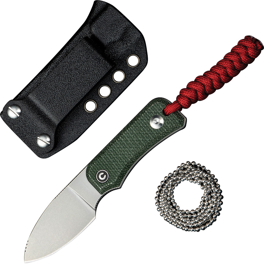 5″ (12.7cm) overall. 2.38″ (6.05cm) stonewash finish Nitro V steel drop point blade. Green canvas micarta handle. Full tang. Lanyard hole. Red braided paracord lanyard. Black Kydex neck sheath. Boxed.