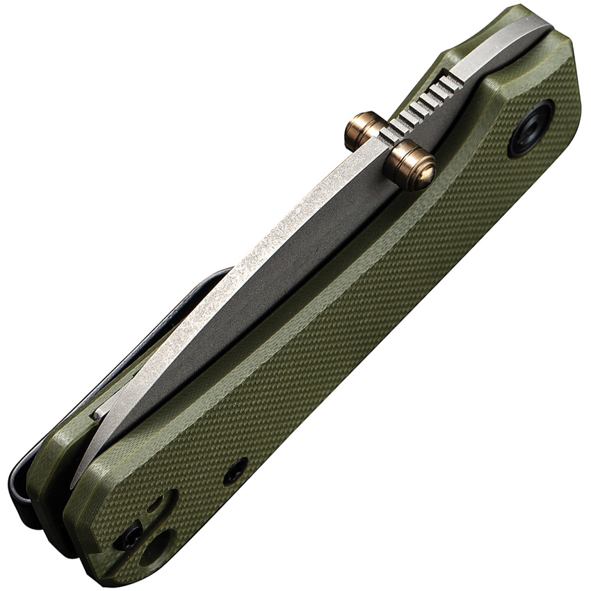 3.13″ (7.95cm) closed. 2.25″ (5.72cm) stonewash finish Nitro V steel blade. Green G10 handle. Thumb stud. Lanyard hole. Pocket clip. Black nylon zippered storage case. Boxed.