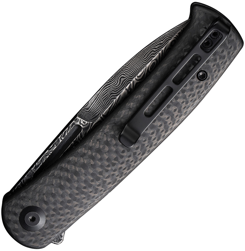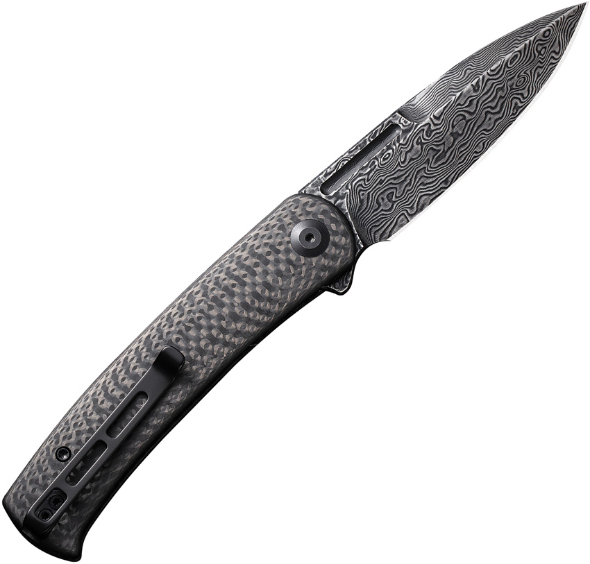 4.5″ (11.43cm) closed. 3.5″ (8.89cm) Damascus steel blade. Carbon fiber handle. Extended tang. Pocket clip. Black nylon zippered storage case. Boxed.