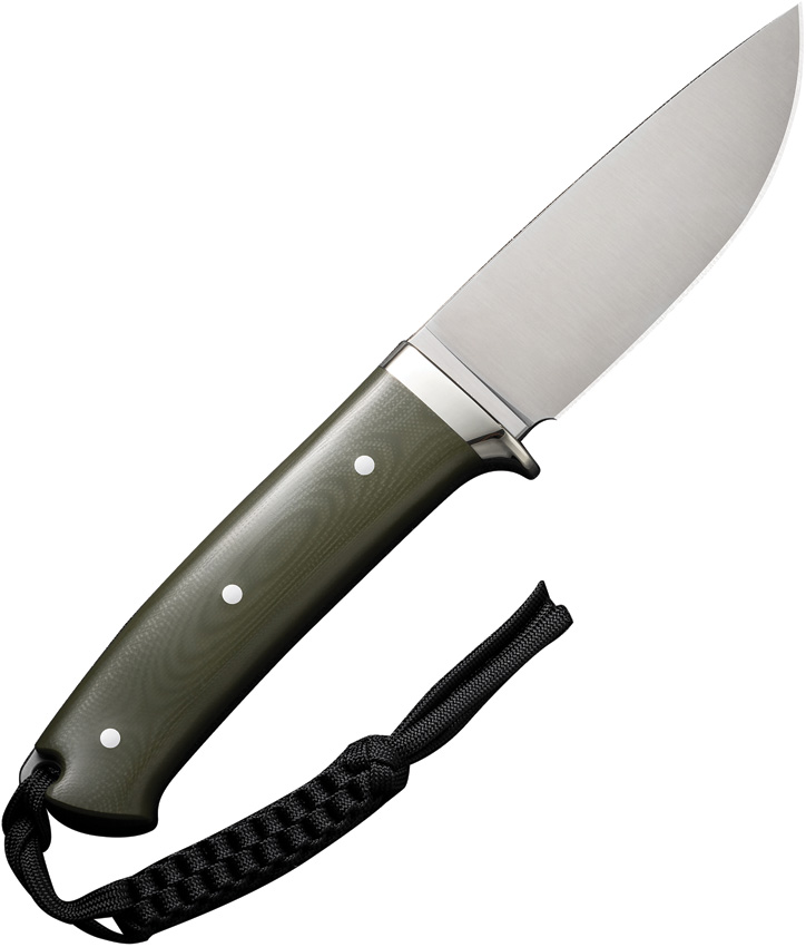 9.5″ (24.13cm) overall. 4.63″ (11.76cm) satin finish Nitro V steel drop point blade. Green G10 handle. Nickel silver guard. Full tang. Lanyard hole. Brown leather belt sheath. Boxed.