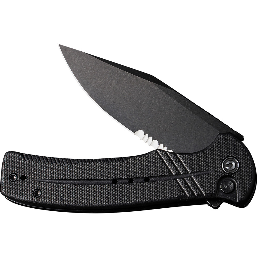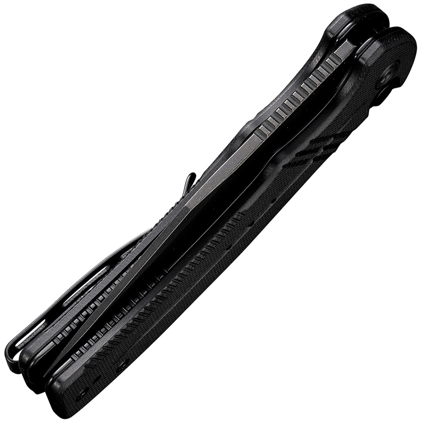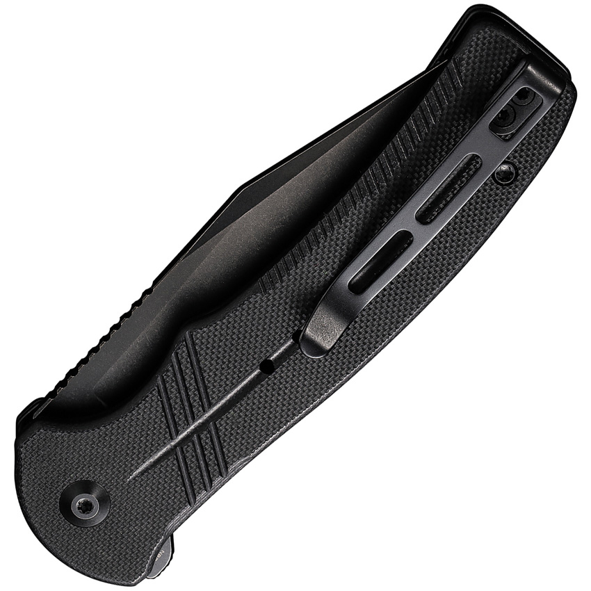 4.5″ (11.43cm) closed. 3.5″ (8.89cm) black stonewash finish partially serrated 14C28N Sandvik stainless clip point blade. Black G10 handle. Extended tang. Pocket clip. Black nylon zippered storage case. Boxed.