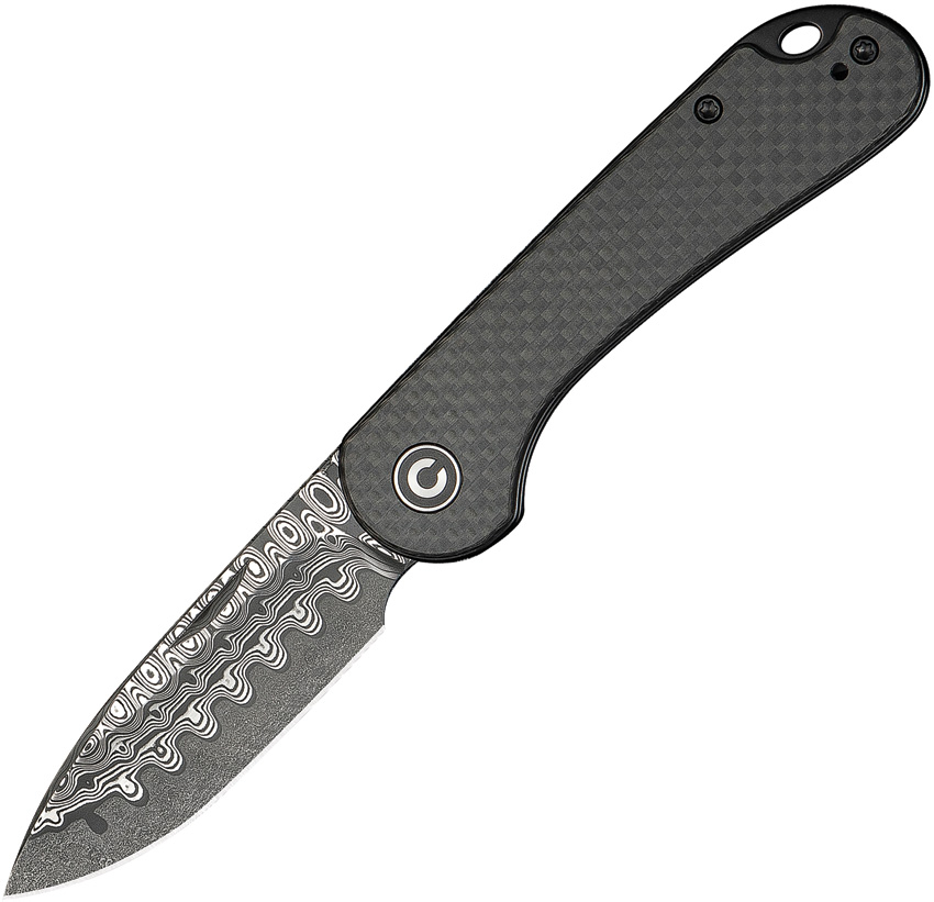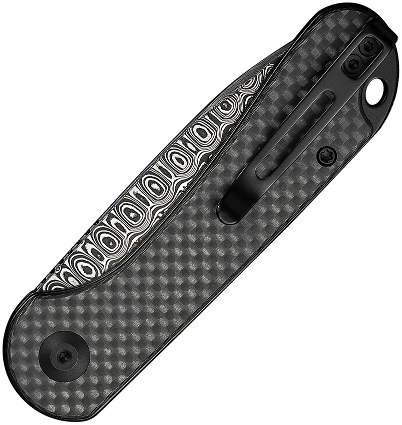 4″ (10.16cm) closed. 3″ (7.62cm) Damascus steel drop point blade. Twill carbon fiber handle. Lanyard hole. Pocket clip. Slip joint. Black nylon zippered storage case. Boxed.