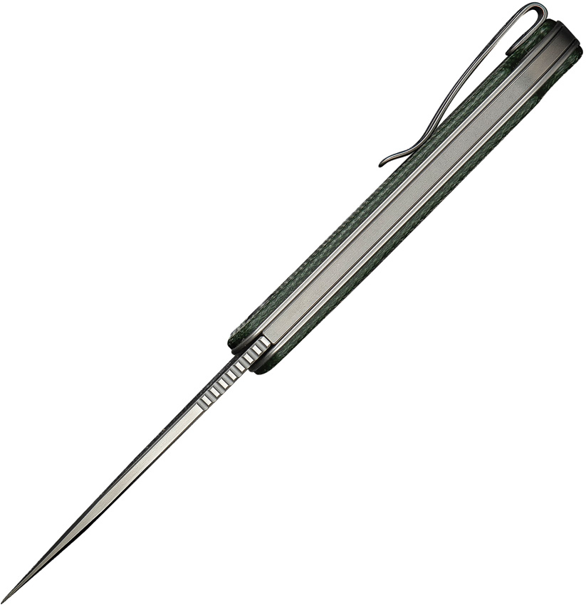 4″ (10.16cm) closed. 3″ (7.62cm) satin finish 14C28N Sandvik stainless drop point blade. Green canvas micarta handle. Lanyard hole. Pocket clip. Slip joint. Black nylon zippered storage case. Boxed.