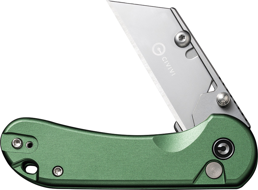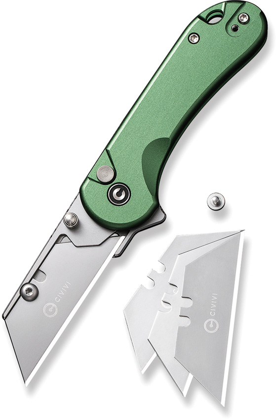 3.63″ (9.22cm) closed. Green aluminum handle. Extended tang. Lanyard hole. Pocket clip. Thumb stud. 2.25″ stonewash finish stainless blade holder. Comes with four Cr6 stainless replaceable blades. Black nylon zippered storage case. Boxed.