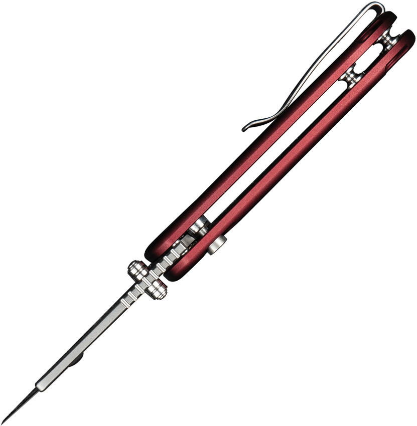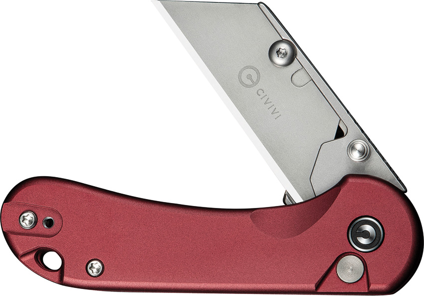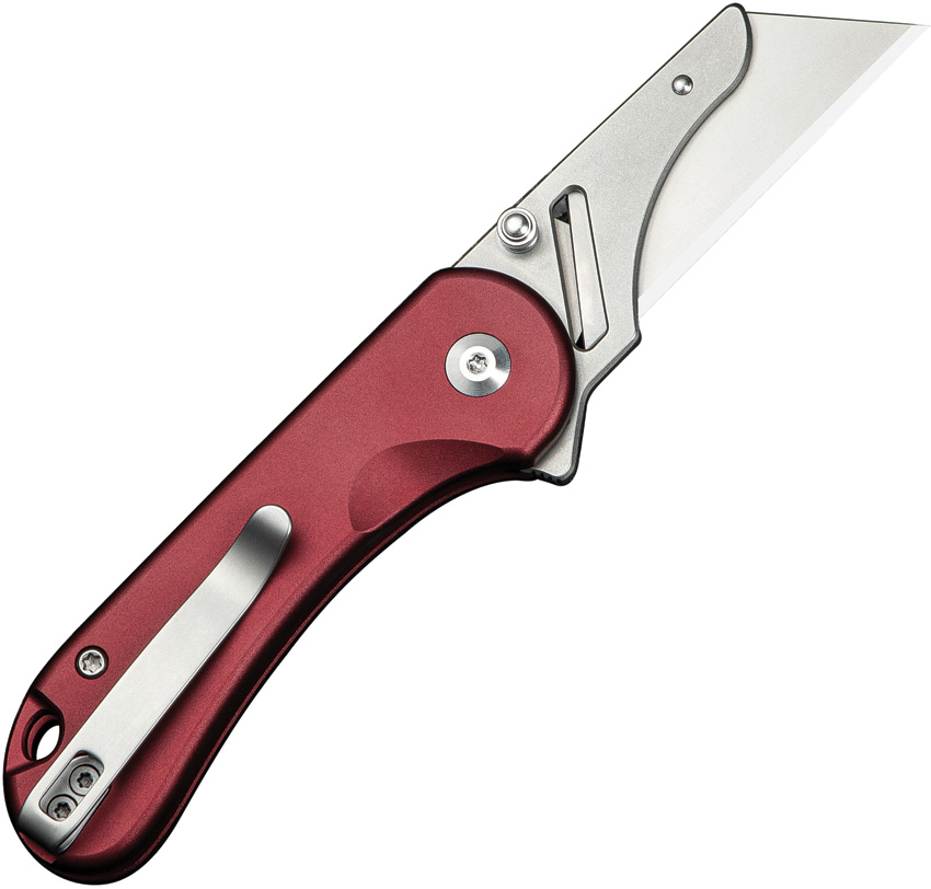 3.63″ (9.22cm) closed. Burgundy aluminum handle. Extended tang. Lanyard hole. Pocket clip. Thumb stud. 2.25″ stonewash finish stainless blade holder. Comes with three Cr6 stainless replaceable blades. Black nylon zippered storage case. Boxed.