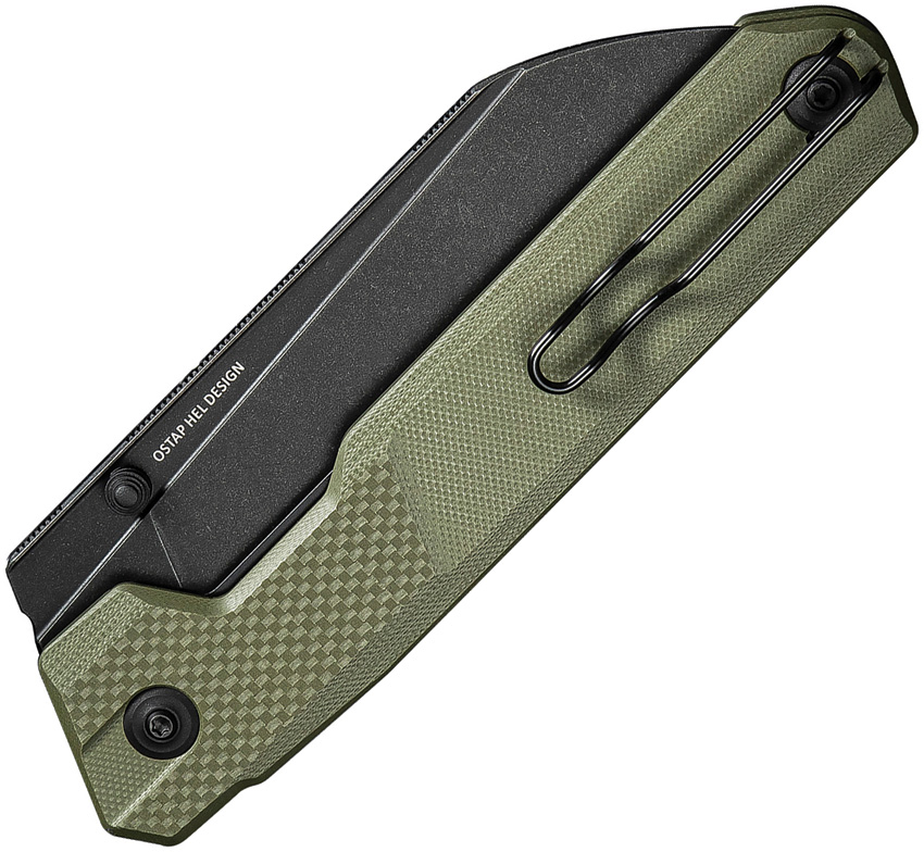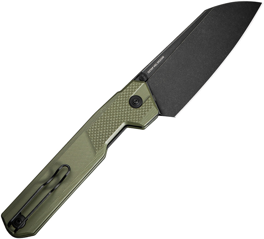 5.75″ (14.61cm) closed. 4.13″ (10.49cm) black stonewash finish 14C28N Sandvik stainless blade. OD green G10 handle. Thumb stud. Pocket clip. Reverse tanto blade. Black nylon zippered storage case. Boxed.