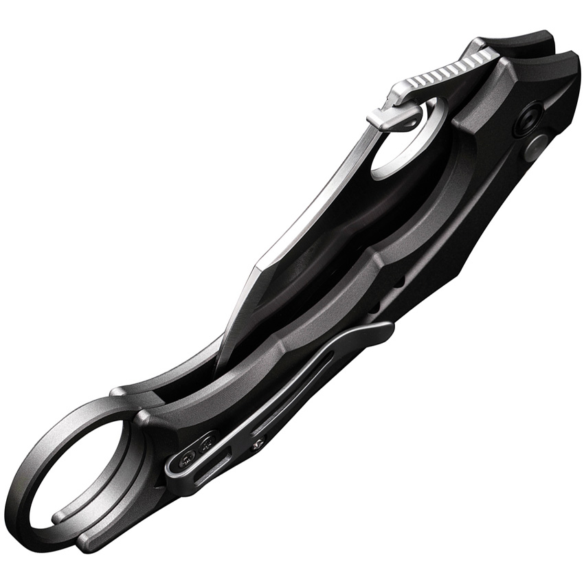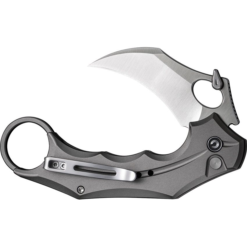 5″ (12.7cm) closed. 2″ (5.08cm) satin finish Nitro V steel karambit blade. Gray anodized aluminum handle. Extended tang. Finger ring. Pocket clip. Thumb pull. Black nylon belt sheath. Boxed.