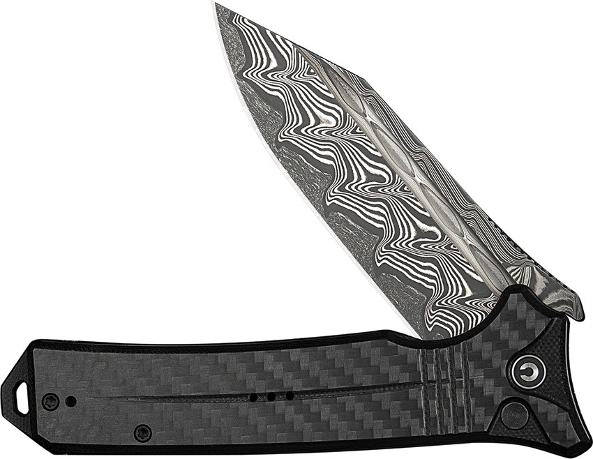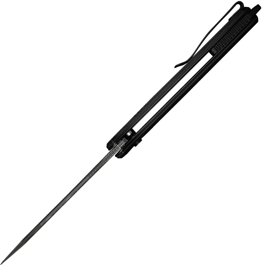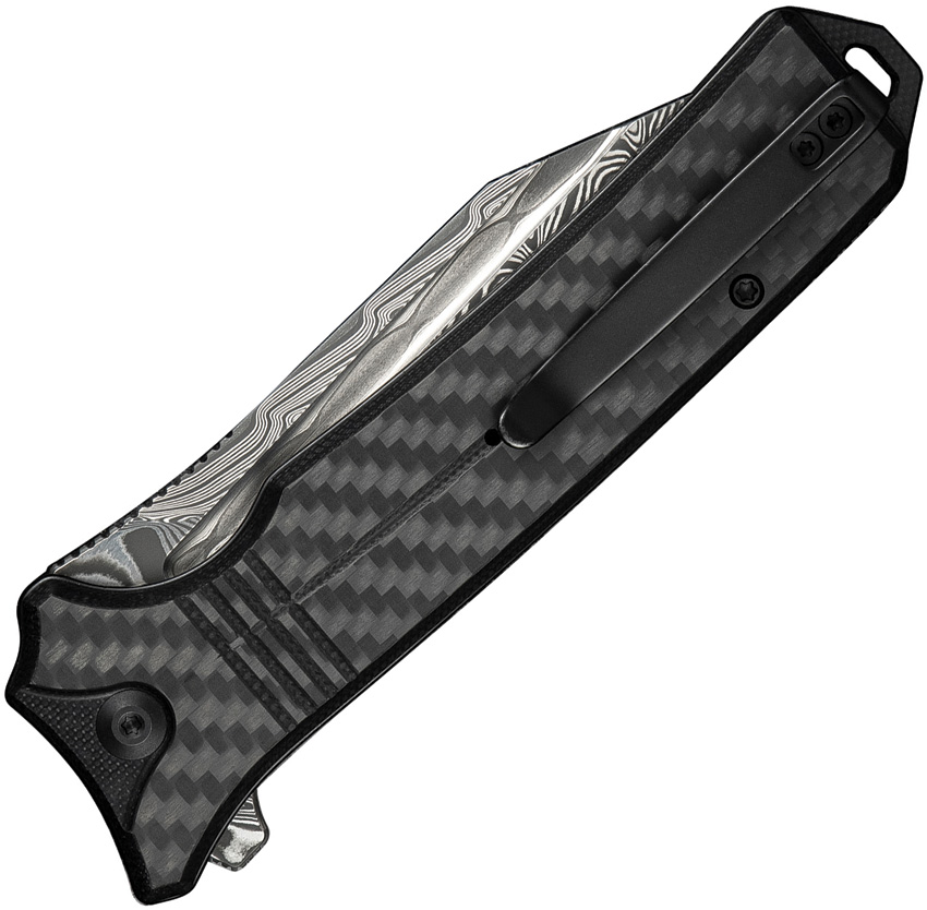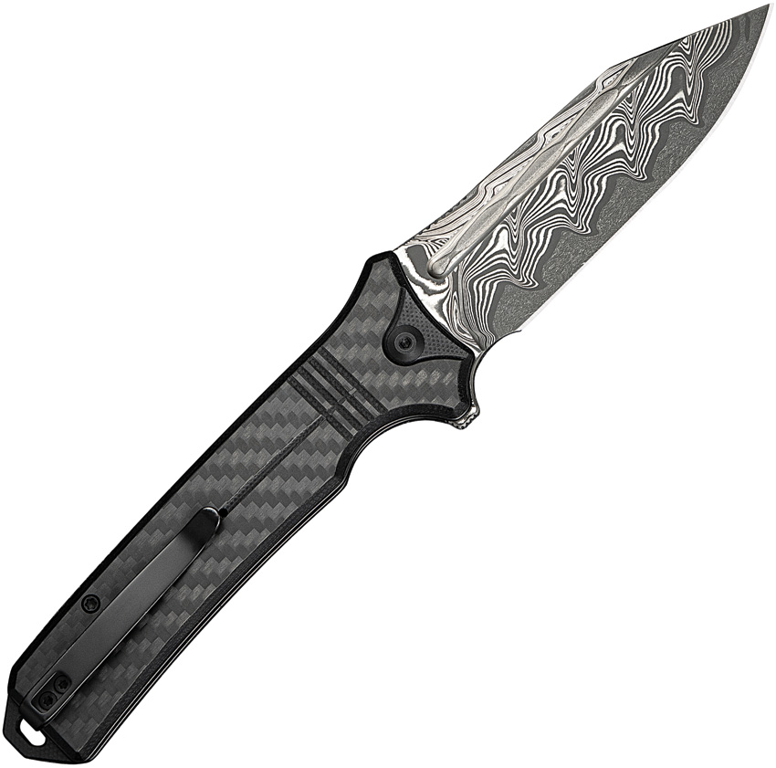 5.13″ (13.03cm) closed. 3.75″ (9.53cm) Damascus steel clip point blade. Black G10 handle with carbon fiber overlay. Extended tang. Lanyard hole. Pocket clip. Black nylon zippered storage case. Boxed.