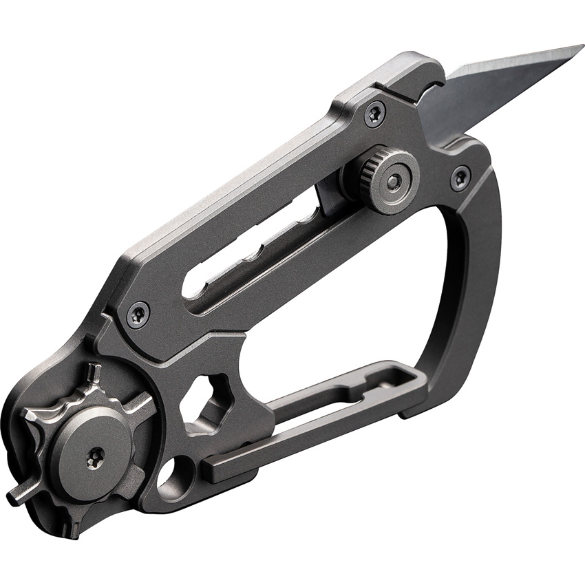 Dimensions: 2.8″ x 1.65″. Tools include: Hex/Bit driver l Carabiner l Small screwdriver l Lanyard loop. Includes: (3) 9Cr18MoV replaceable blades. Titanium construction. Color: Gray. Boxed.