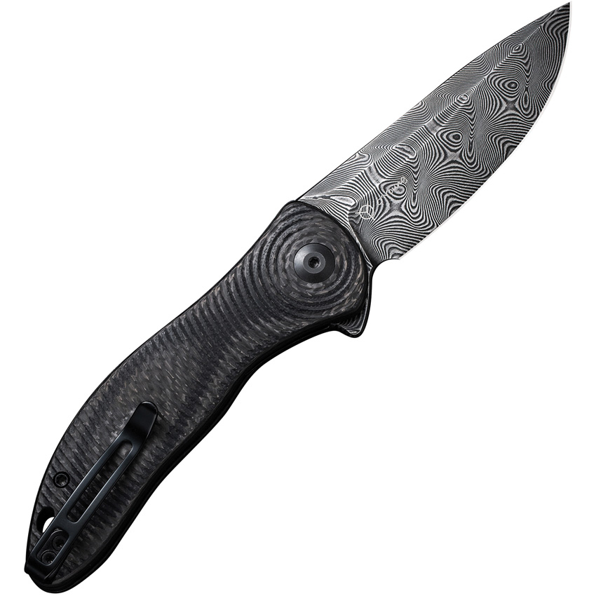 4.38″ (11.13cm) closed. 3.25″ (8.26cm) Damascus steel blade. Extended tang. Lanyard hole. Pocket clip. Layered black G10 and twill carbon fiber handle. Black nylon zippered storage case. Boxed.