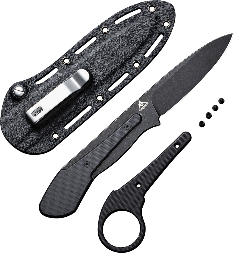 7.88″ (20.02cm) overall. 3.75″ (9.53cm) black stonewash finish D2 tool steel drop point blade. Black G10 handle. Comes with extra handle with finger ring. Black Kydex belt sheath. Boxed.