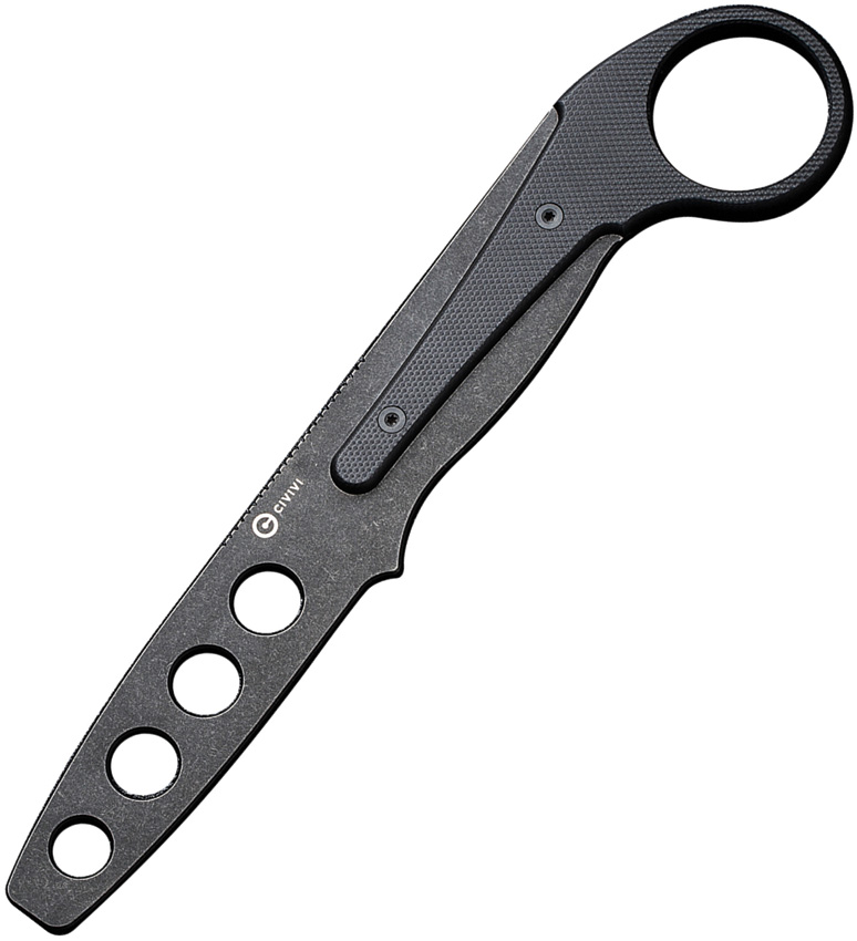 7.38″ (18.75cm) overall. 3.25″ (8.26cm) black stonewash finish unsharpened D2 tool steel blunt tip blade. Black G10 handle. Finger ring. Comes with extra conventional handle. Black Kydex belt sheath. Boxed.